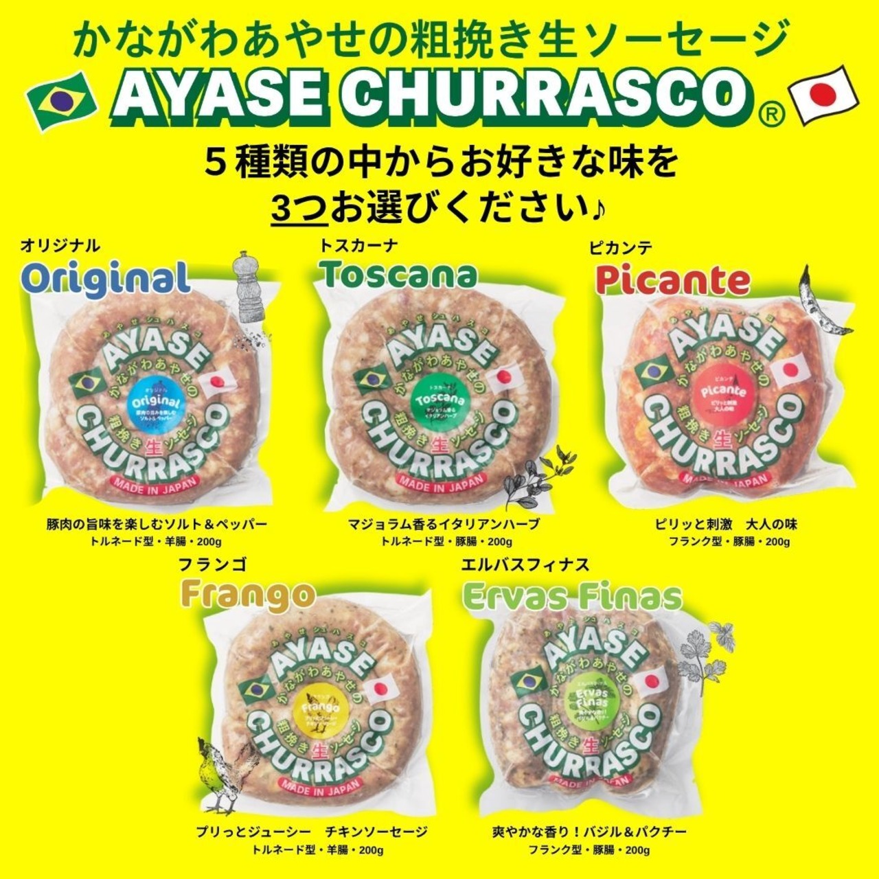 神奈川県産の原料肉を使用した こだわりの「あやせシュハスコ」からお好きな味3つをお選びいただける、通常価格より10%(264円)お得なセットです!