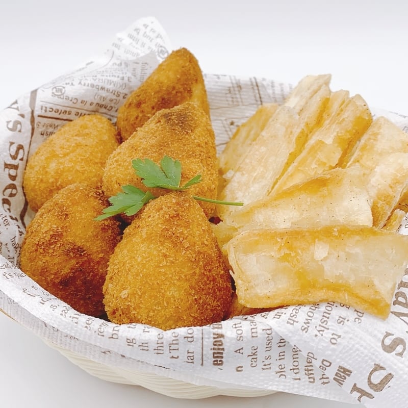 └キャッサバ芋(タピオカ芋)を生地に使用した、しずく型のコロッケ。